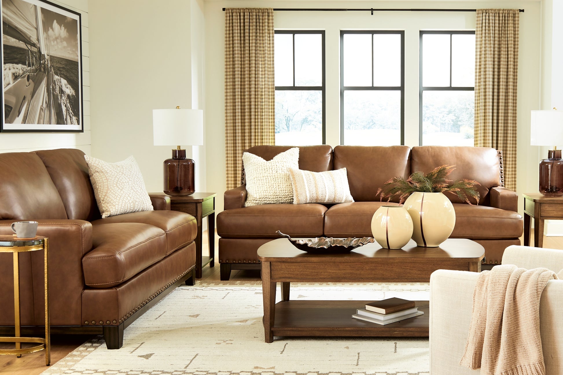Effortlessly stylish, indulgently comfortable. This seating package encourages everyday relaxation with invitingly plush, extra-spacious cushions. It embodies affordable luxury, pairing the sleek appeal of top grain leather in the seating area with expertly matched faux leather on the sides and back. Suiting spaces from casual to contemporary, the set's universal appeal makes staging your space nearly effortless.